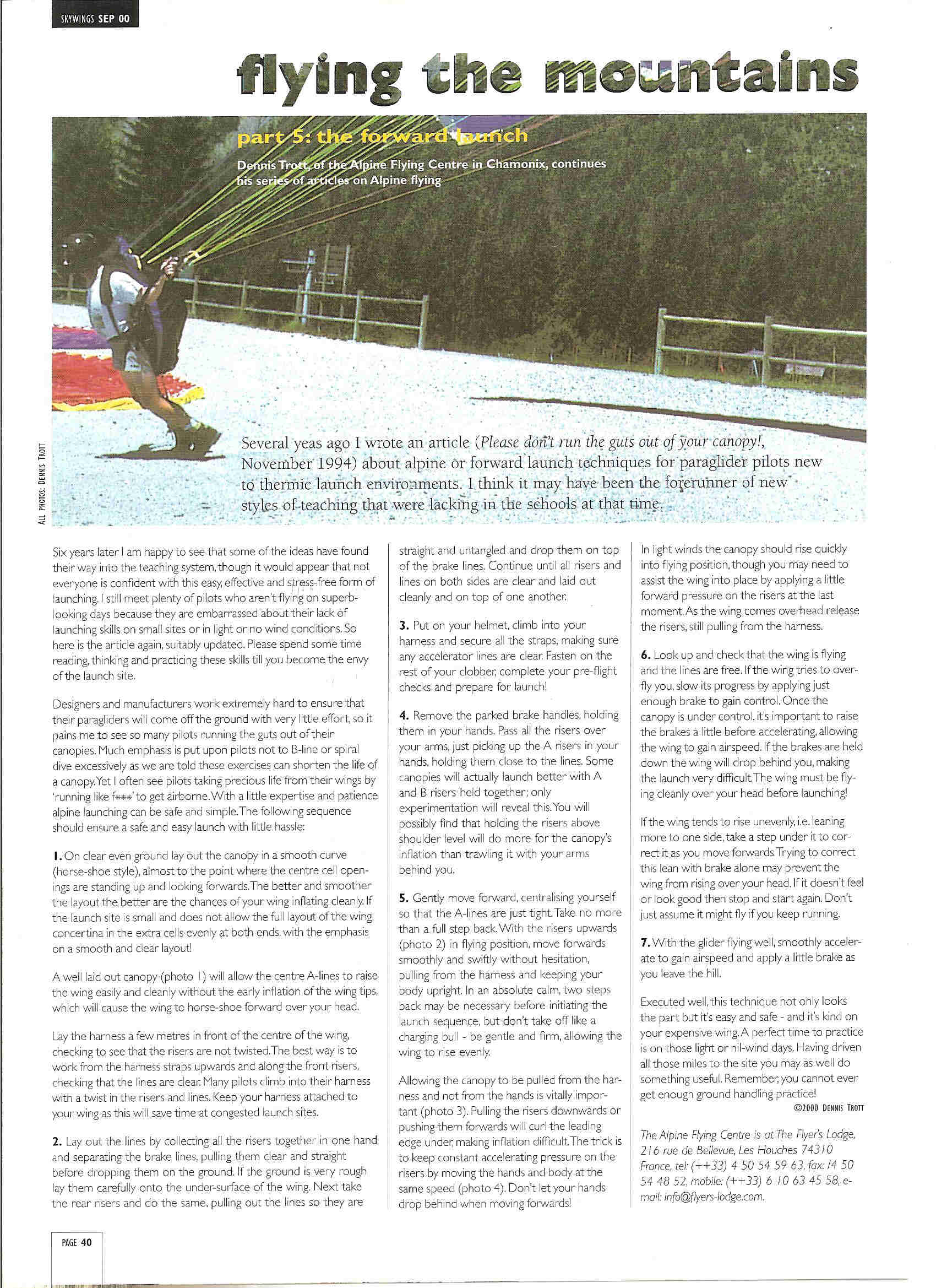 Back 1994 I started the series with 2 articles on launch techniques. The articles were republished in 2000 with more recent photos. Below are both sets of articles and you will see that the techniques haven't really changed over the years and are still widely taught throughout the alps. Happily to say that the Brits were the first to use cross brake launch techniques when the Europeans were still struggling with a forward launch in strong conditions and not employing the easier reverse launch technique. This has now changed and snappy reverse launches are common here in the mountains.